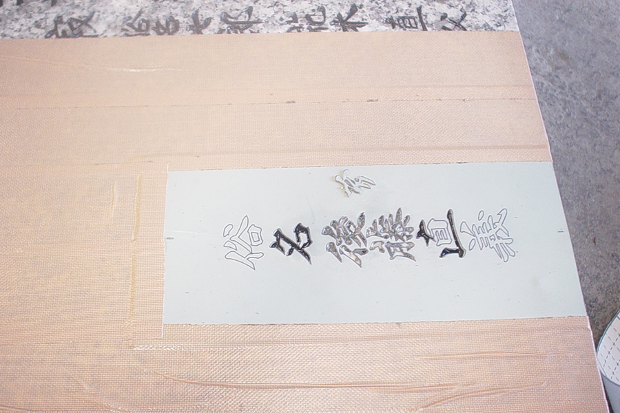 [colwrap] [col2]原稿が完成したら、専用の機械で彫刻用のゴム板をカットし、墓誌の彫刻位置に貼り付けます。[/col2] [col2][/col2] [/colwrap]